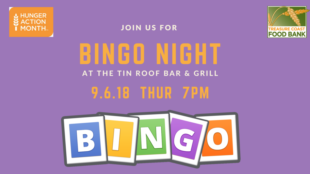 As a Kick Off to Hunger Action Month, on September 6th, the Treasure Coast Food Bank will be hosting BINGO at the Tin Roof Bar and Grill. A portion of the proceeds will go to Treasure Coast Food Bank.