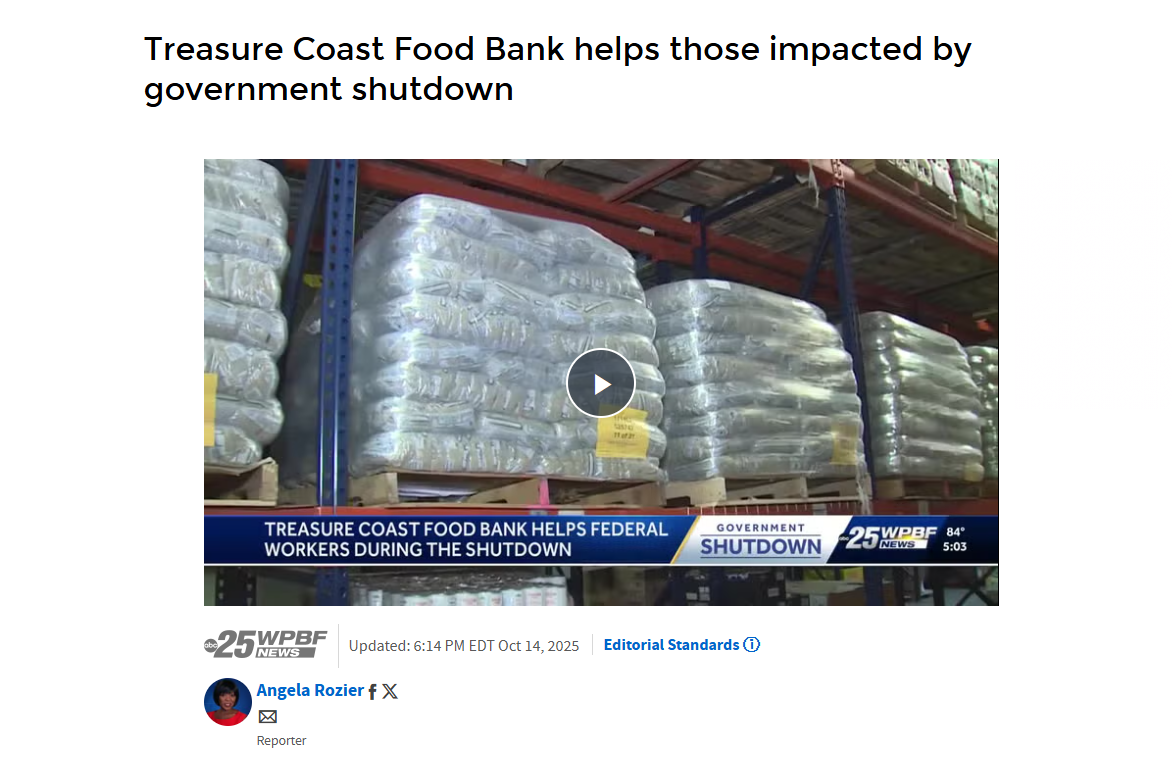 During the government shutdown, Treasure Coast Food Bank has seen a growing number of federal workers—like postal employees, IRS staff, airport personnel, and military families—turn to us for support. At Treasure Coast Food Bank, we serve more than 250,000 people each week across Martin, St. Lucie, Indian River, and Okeechobee Counties, and that number is rising. We’ve already welcomed an additional 25,000 to 30,000 neighbors seeking food assistance. While some food commodities are no longer available to us, we’re doing everything we can to ensure our community has access to the essentials.